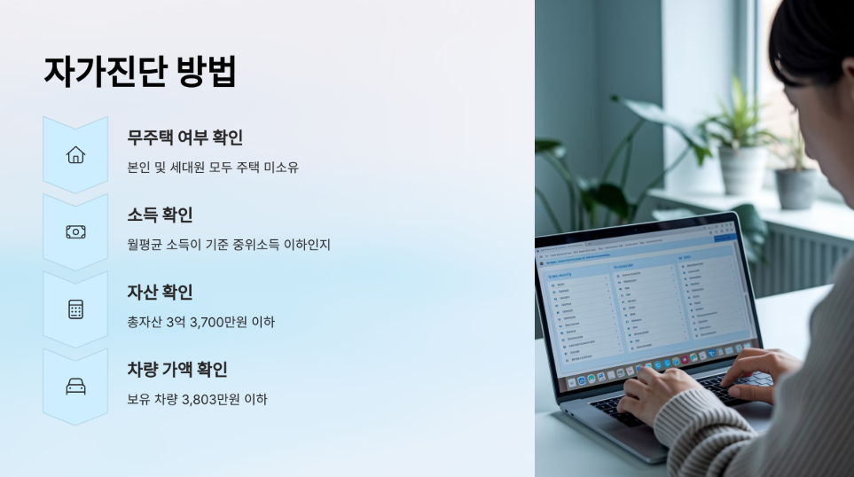앞서 안내드린 자가진단 방법을 통해 본인의 소득, 자산, 무주택 여부 등을 점검해 보고, 자격에 부합하는지 먼저 확인해 보는 것이 중요합니다.