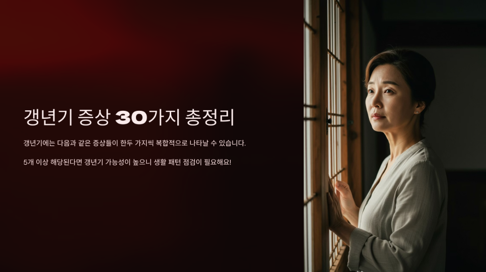 갱년기는 다양한 신체·정신 증상으로 나타나는 중년기의 자연스러운 변화입니다.