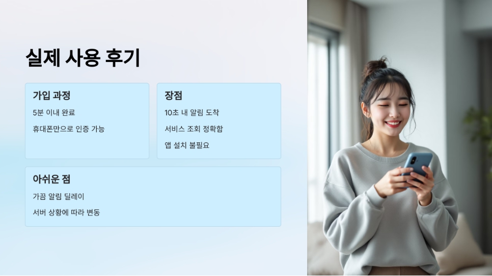 - 홈페이지 접속 → 본인인증 → 서비스 신청까지 5분도 안 걸렸어요.