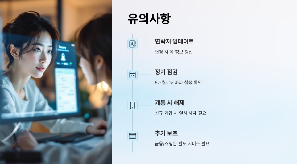 (본인이 새 폰을 개통할 때는 직접 해제 후 다시 설정해야 합니다.) - 금융/쇼핑 명의도용은 별도 관리 필요