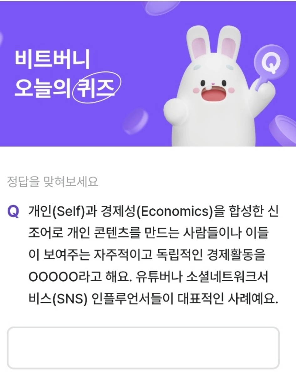 개인(Self)과 경제성(Economics)을 합성한 신조어로, 개인 콘텐츠를 만드는 사람들이나 이들이 보여주는 자주적이고 독립적인 경제활동을 OOOOO라고 해요.