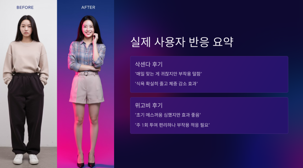 - 위고비 후기: "처음 2~3주는 메스꺼움이 심했지만 효과는 진짜 좋았어요." "주 1회만 맞는 게 편하긴 한데 부작용 적응이 필요해요."