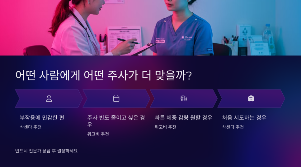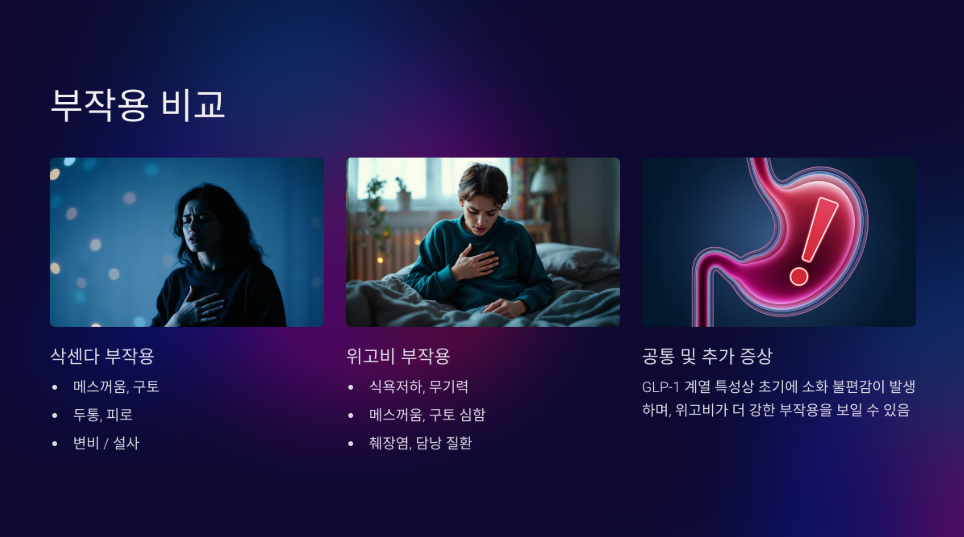 → 부작용이 걱정된다면 삭센다, 빠른 효과가 우선이면 위고비를 고려해 보세요.