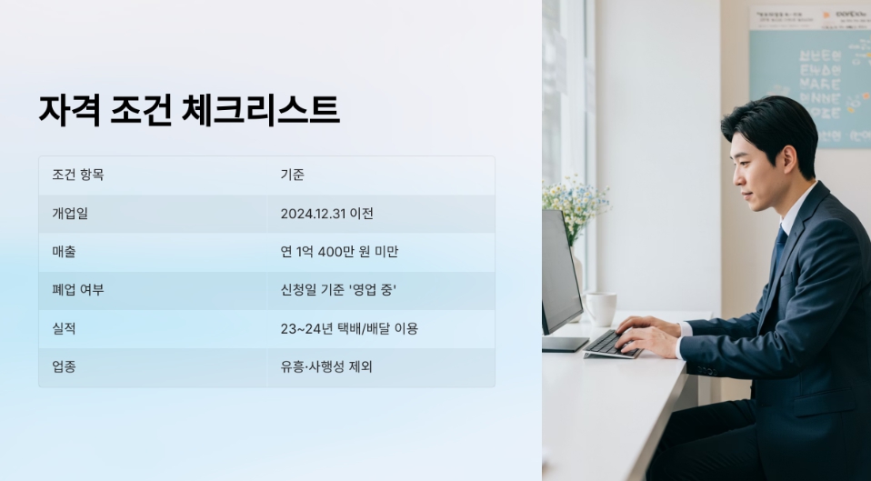 - 대상: 매출 1억 400만 원 이하, 배달/택배 실적 있는 소상공인