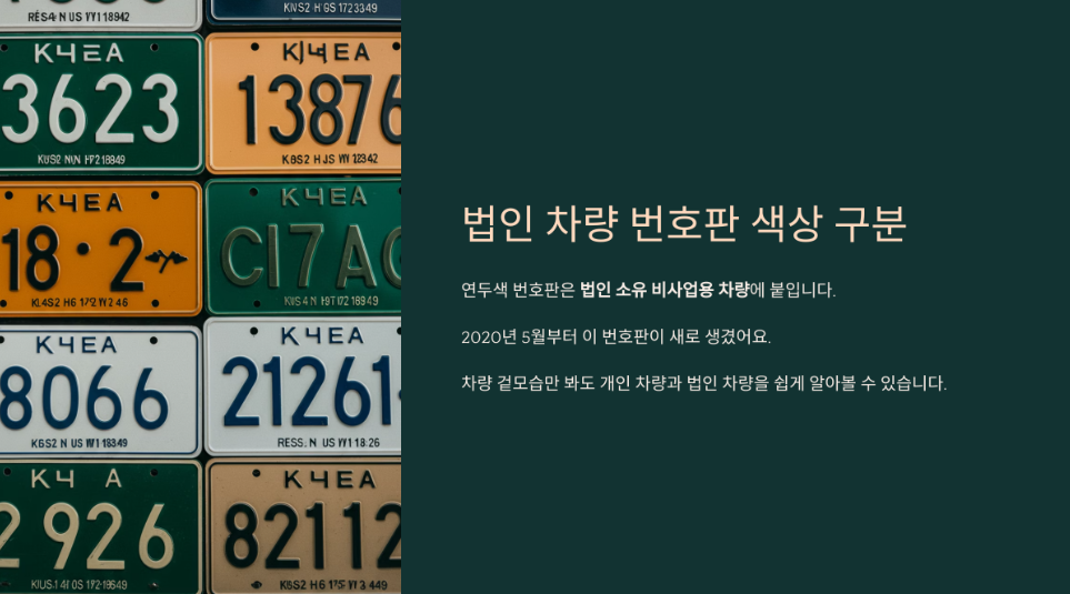 - 2020년 5월부터 시행된 자동차번호판 체계 개편에 따라 개인과 법인 차량을 외관상으로 구분하기 위해 도입