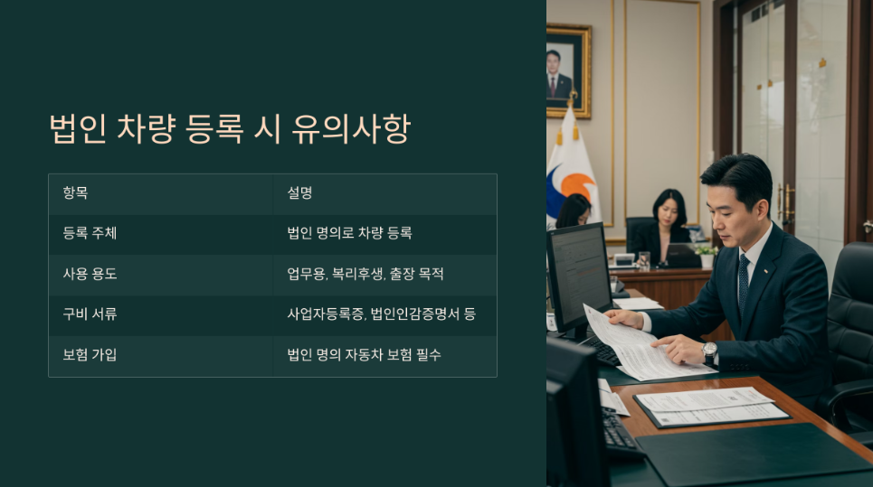 | 등록 주체 | 법인 명의로 차량 등록 (개인 명의 아님) |