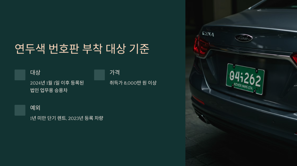 - 법인명의로 등록된 비사업용 차량은 모두 연두색 번호판 부착 대상