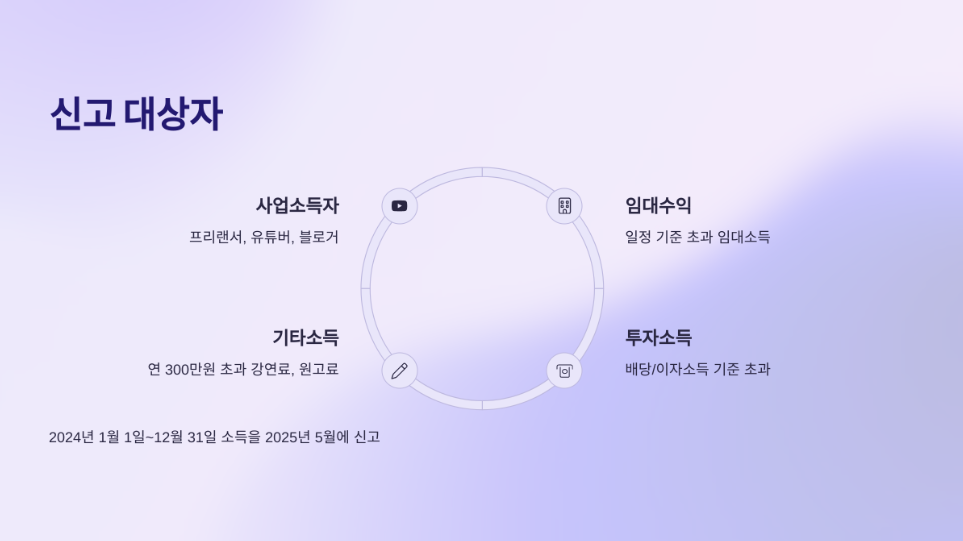 꼭 자영업자나 사업자만 해당되는 게 아니라, 근로소득 외의 부가적인 수익이 있는 사람이라면 누구나 신고 대상이 될 수 있습니다.