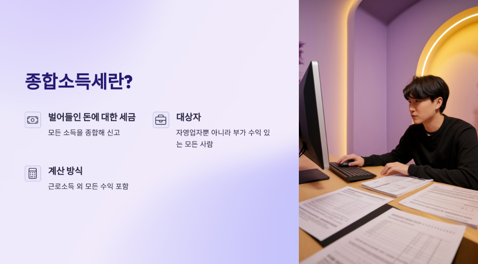 종합소득세는 한 해 동안 발생한 모든 소득을 종합해서 신고하고 세금을 내는 제도예요.