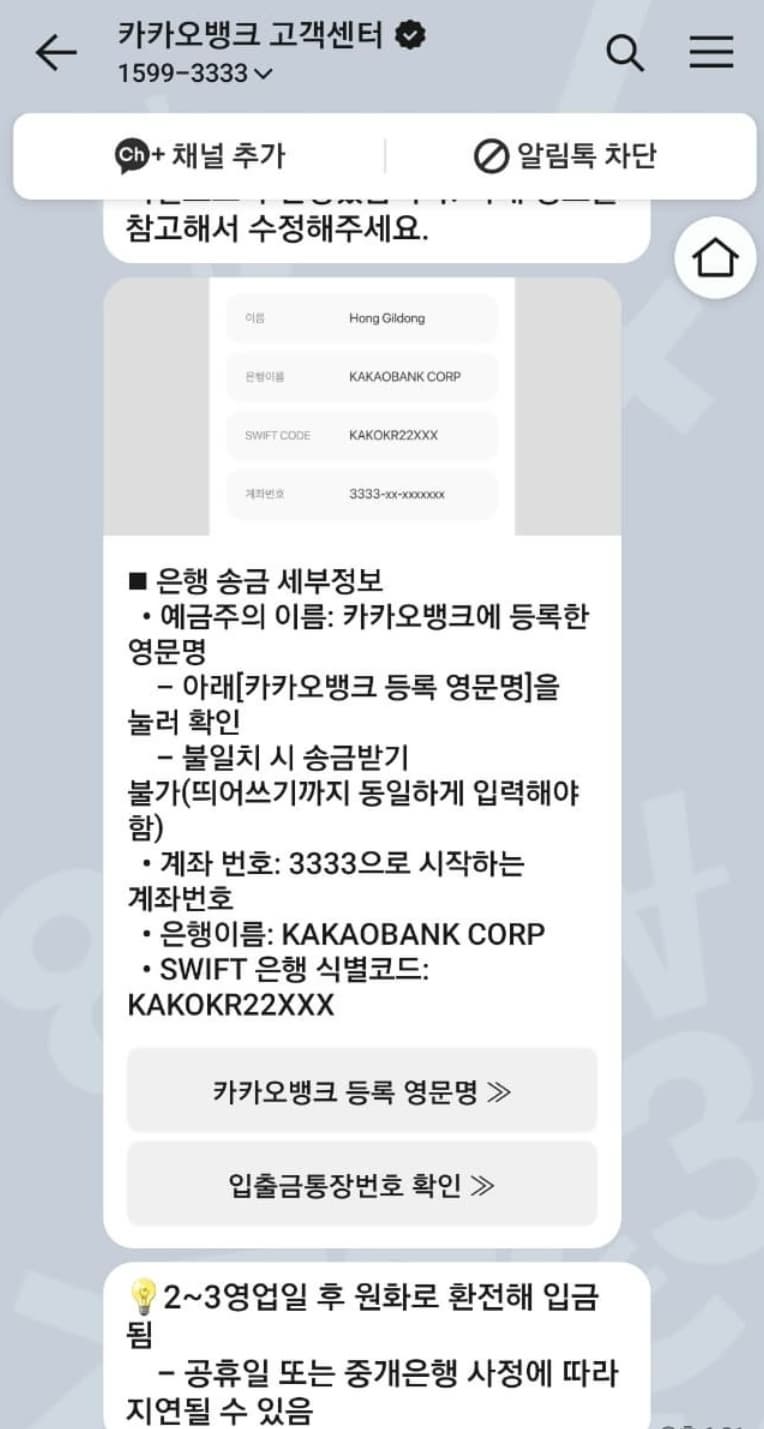 | 계좌번호 포맷 | 3333으로 시작하는 외화계좌 + 본인 영문 이름 일치 |