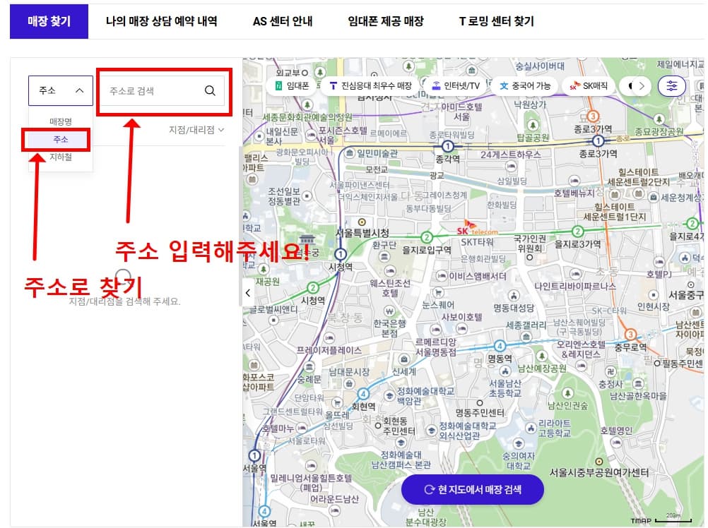 SKT 대리점 위치 검색 화면 – 주소 입력으로 찾기