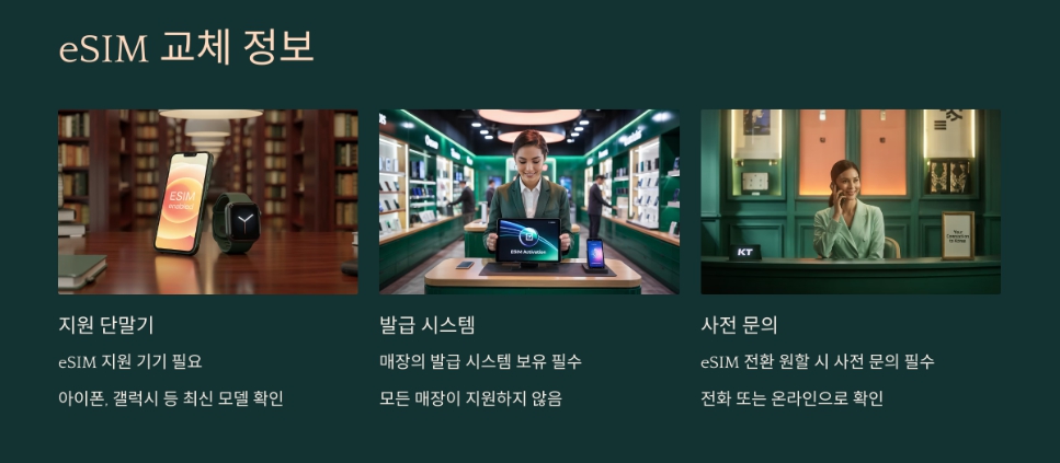 두 가지 조건을 충족해야만 교체가 가능하므로, eSIM으로 전환을 원하신다면 사전 문의가 필수입니다.